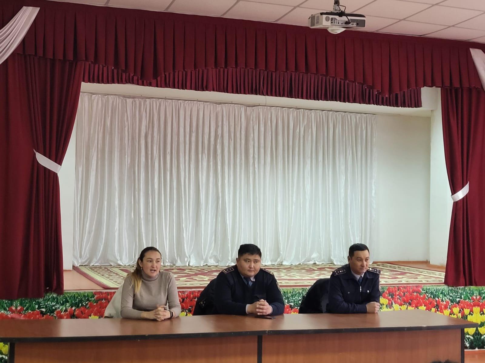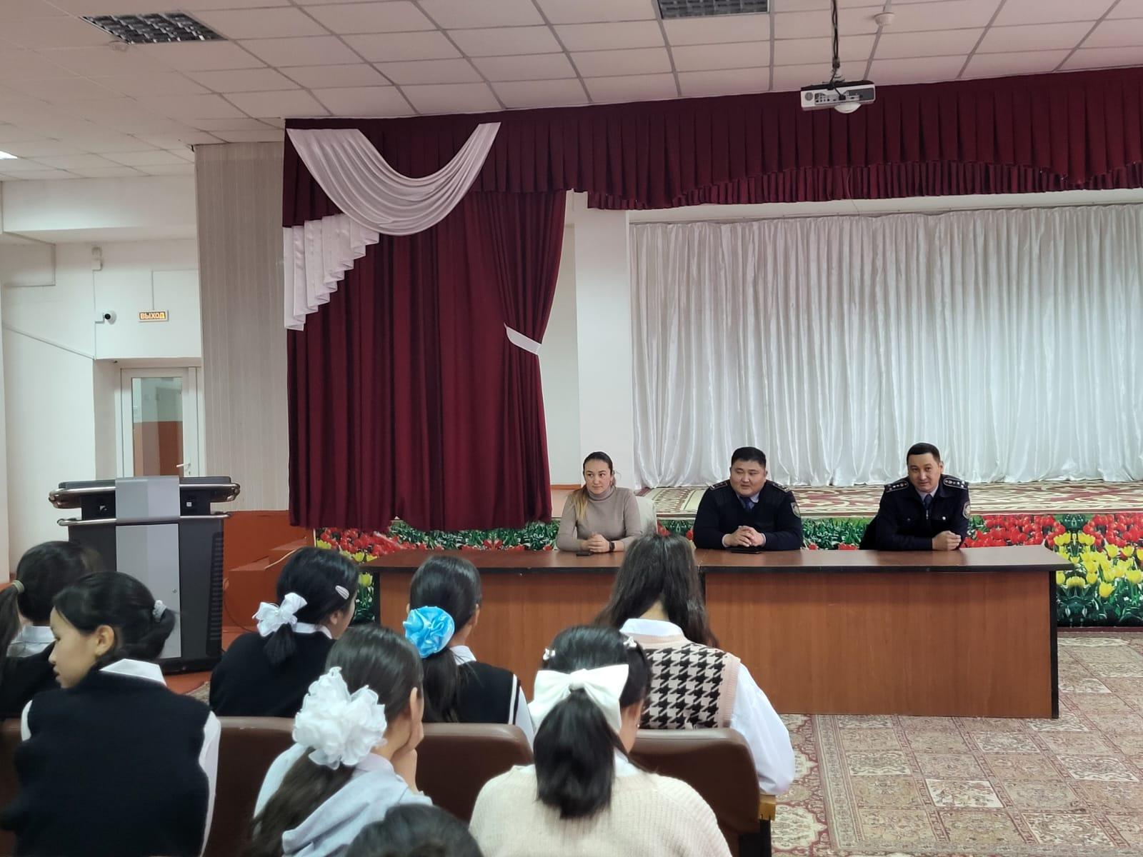 Оқушылардың құқықтық сауаттылығын арттыру, салауатты өмір туралы ұғымдарын кеңейту, қауіпсіздік ережелерімен таныстыру сонымен қатар оқушылар арасында орын алып жатқан құқық бұзушылықтың алдын алу мақсатында мектебімізде қараша айының 21 күні Ақсу АПБ ЖПҚБ ЮПТ инспекторы полиция аға лейтенанты Мамырбекова Назерке Сабырбекқызымен кездесу ұйымдастырылып өткізілді. Оқушыларға бүгінгі күндегі өзекті мәселелер, орын алып жатқан жәйіттер туралы айтып, оқушыларды құқықтық сауатты бола отырып, өз міндеттерін ұмытпауға шақырды. Кездесуде оқушылар да өздерін қызықтырған сұрақтарын ортаға салып, жауаптарын алды.