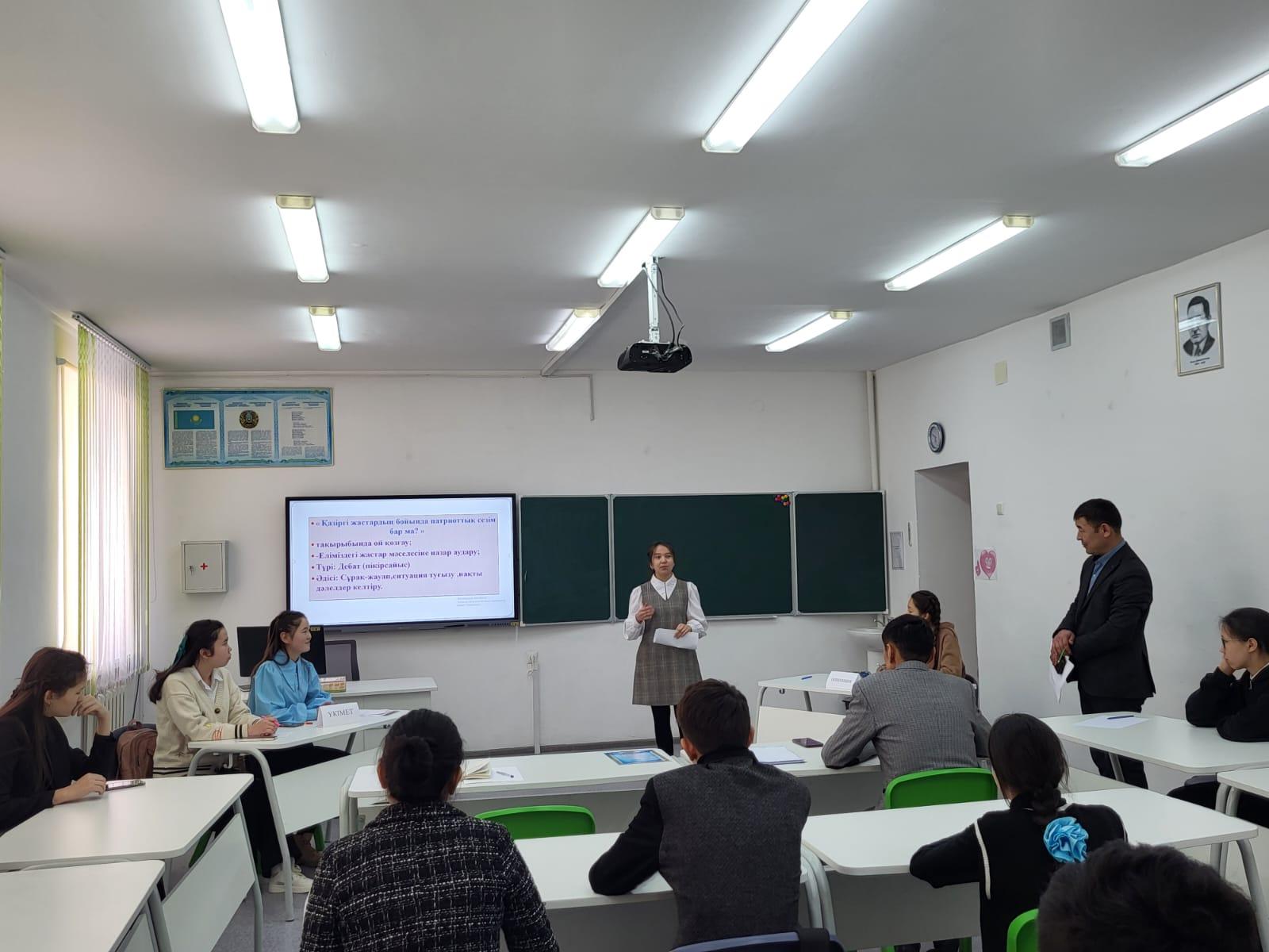 "Ризашылық- мейірімділік бұлағы" жалпы ұлттық мәдени-білім беру жобасы аясында өткен мектепішілік турнир"Қазіргі таңда жастардың бойында патриоттық сезім бар ма?"тақырыбында дебат өткізілді.