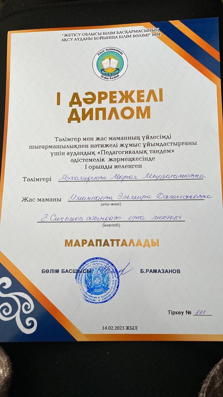 Аудандық "Педагогикалық тандем" әдістемелік жәрмеңкесіне мектебіміздің жас маманы, бастауыш сынып мұғалімі Э.Иманбаева мен тәлімгер маман, бастауыш сыныптың мұғалімі М.Мұхамедиева қатысып, жүлделі 1-орынды жеңіп алды. Жаңадан педагогикалық еңбек жолын бастап жатқан мамандар үшін бұндай байқаулардың рөлі зор. Мұғалімдерге қолдау көрсетіліп, өздеріне деген сенімдерін арттыратын шаралар жас мамандардың алдына нақты мақсат қойып, бағдарын айқындай түседі.