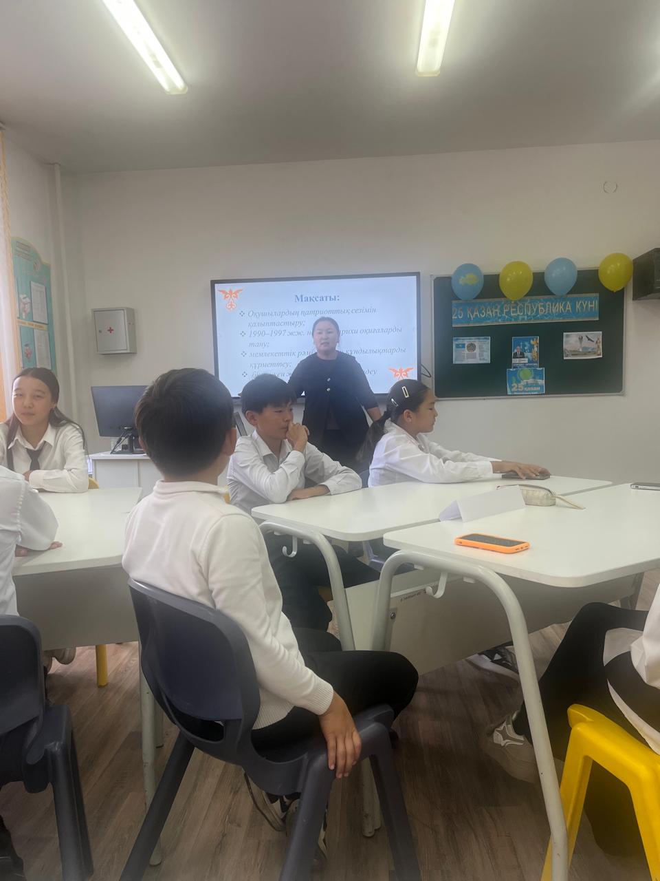 25 қазан -Республика күніне орай мектеп жанындағы интернат оқушыларымен «Қазақстан Республикасы: кеше, бүгін, ертең» тақырыбында тәрбие сағаты болып өтті. Тәрбие сағатының мақсаты: оқушыларға Республика күнінің шығу тарихын, маңызын түсіндіру. таған елге деген сүйіспеншілігін арттыру, ұлттық рухты көтеру және азаматтық жауапкершілікті қалыптастыру. Тәрбие сағаты барысында оқушыларға Республика күнінің Қазақстанның тәуелсіздікке бастар маңызды қадамы болғаны түсіндірілді. Сонмен қатар бейнеролик көрсетіліп, Қазақстан рәміздері, елдің тарихи тұлғалары туралы әңгіме жүргізілді.