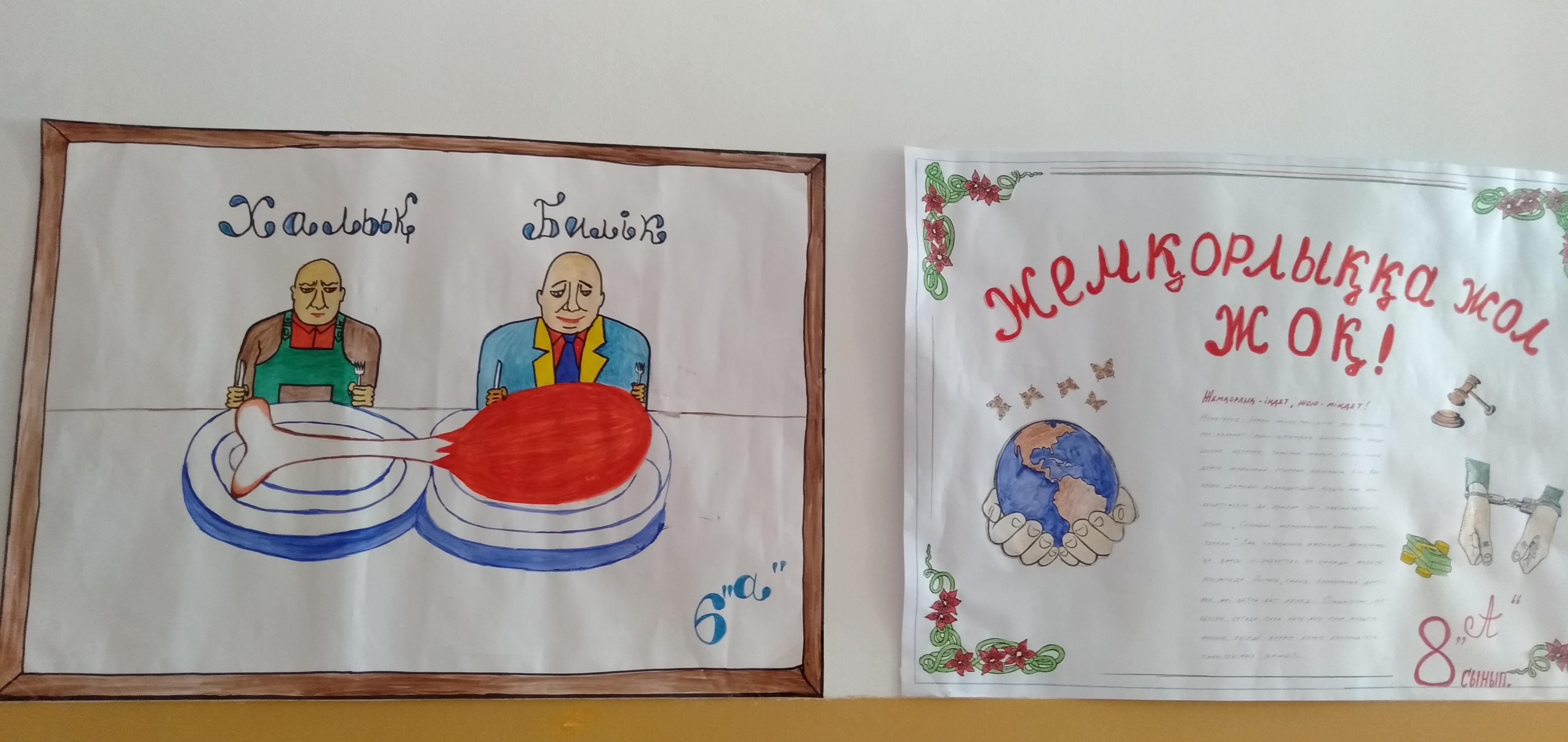 Аудандық білім бөлімінің 2018 жылғы 07 қараша № 1180 бұйрығының негізінде 2018 жылдың 09 қараша мен 09 желтоқсан аралығында 09 қараша-09 желтоқсан аралығындағы Халықаралық сыбайлас жемқорлыққа қарсы күніне орай іс-шара жоспары құрылып, мектеп директорымен бекітілді. Жоспар бойынша «Сыбайлас жемқорлыққа қарсы күрес» тақырыбында қабырға газеттер шығарылды. «Сыбайлас жемқорлықсыз өмір сүрейік» тақырыбында 5-11 сыныптар арасында тәрбие сағаттары өтті. «Сыбайлас жемқорлыққа жол жоқ!» тақырыбында сурет байқауы өтті. Тарих пәнінің мұғалімі Құрайыш Арыс «Біз жемқорлыққа қарсымыз!» тақырыпта дөңгелек үстел өткізілді.