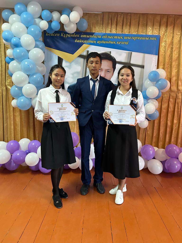 2023 жылдың 19 қазан күні жасөспірімдер арасында Бейсен Құранбек атындағы аудандық шығармашылық байқауға 9-сынып оқушысы Жұлдыз Ердос, 11-сынып оқушысы Асылбайқызы Маржан, 10-сынып оқушысы Серікқызы Мадина қатысты. Байқау қорытындысы бойынша Асылбайқызы Маржан мен Серікқызы Мадина жүлделі ІІ орынға ие болып, облысқа жолдама алды. Пән мұғалімдері А.Кыдырманова мен А.Дүйсебаева. Оқушылармызға сәттілік!