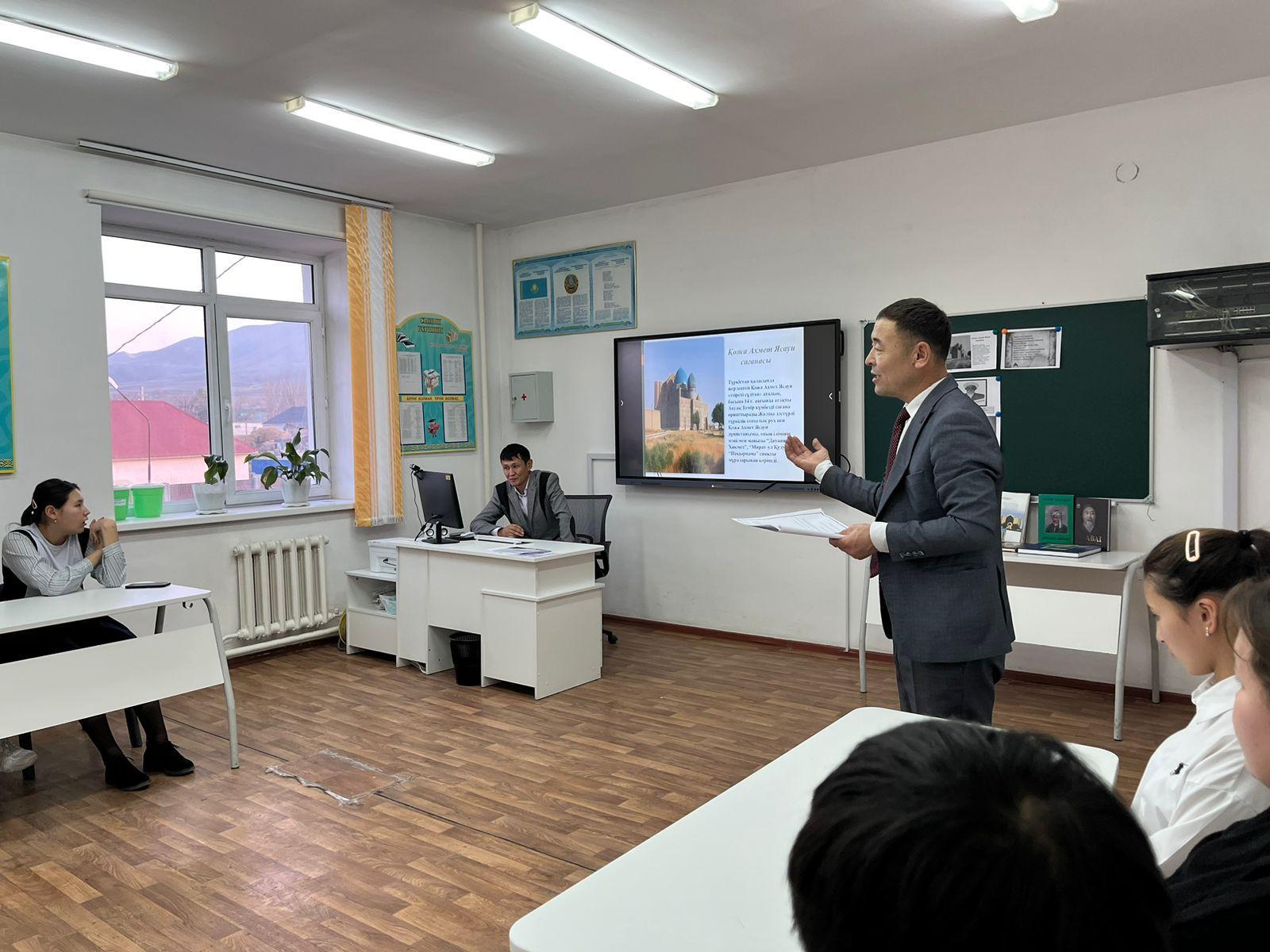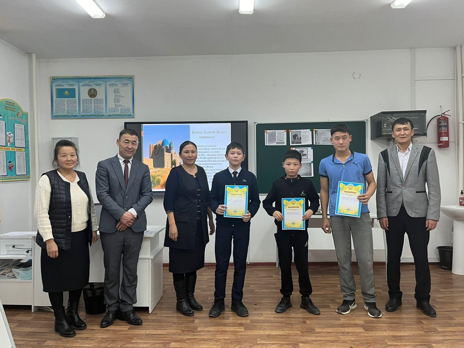 2023-2024 оқу жылындағы әдістемелік жұмыстың жылдық жоспарына сәйкес Қ.А.Ясауидің 930 жылдығына орай "Ұлылар мекеніне саяхат" тақырыбында оқушылар арасында танымдық кеш болып өтті. Кеш барысында тарих пәнінің мұғалімдері А.Құрайыш пен Қ.Сүлейменов   Қ.Ясауи еңбегіндегі дүниетанымдық философиялық тағылымдары туралы және ойшылдар  еңбегін оқып-үйрену мен олардың мұраларына құрмет сезімдерін қалыптастыруға бағыт-бағдар берді.