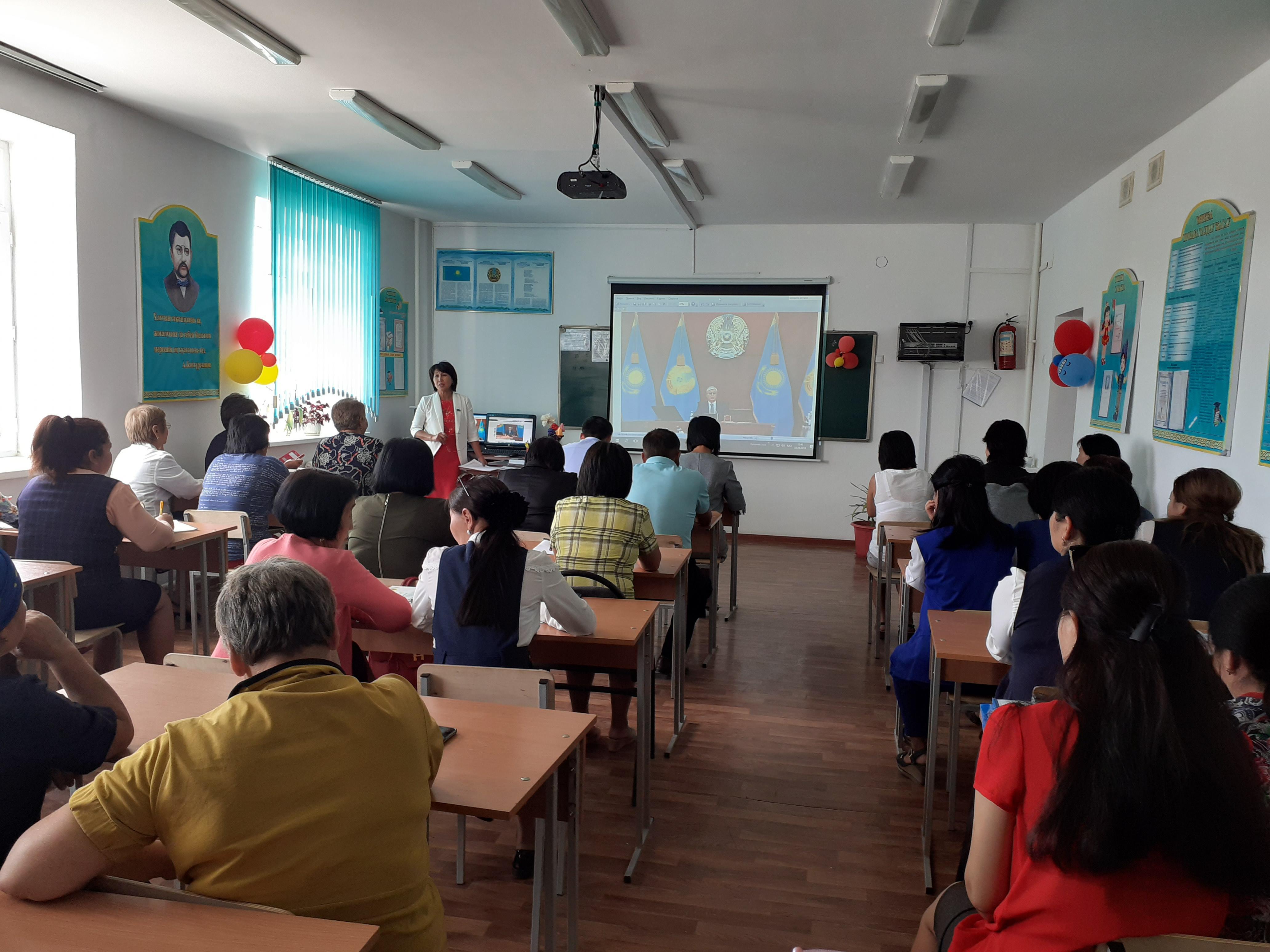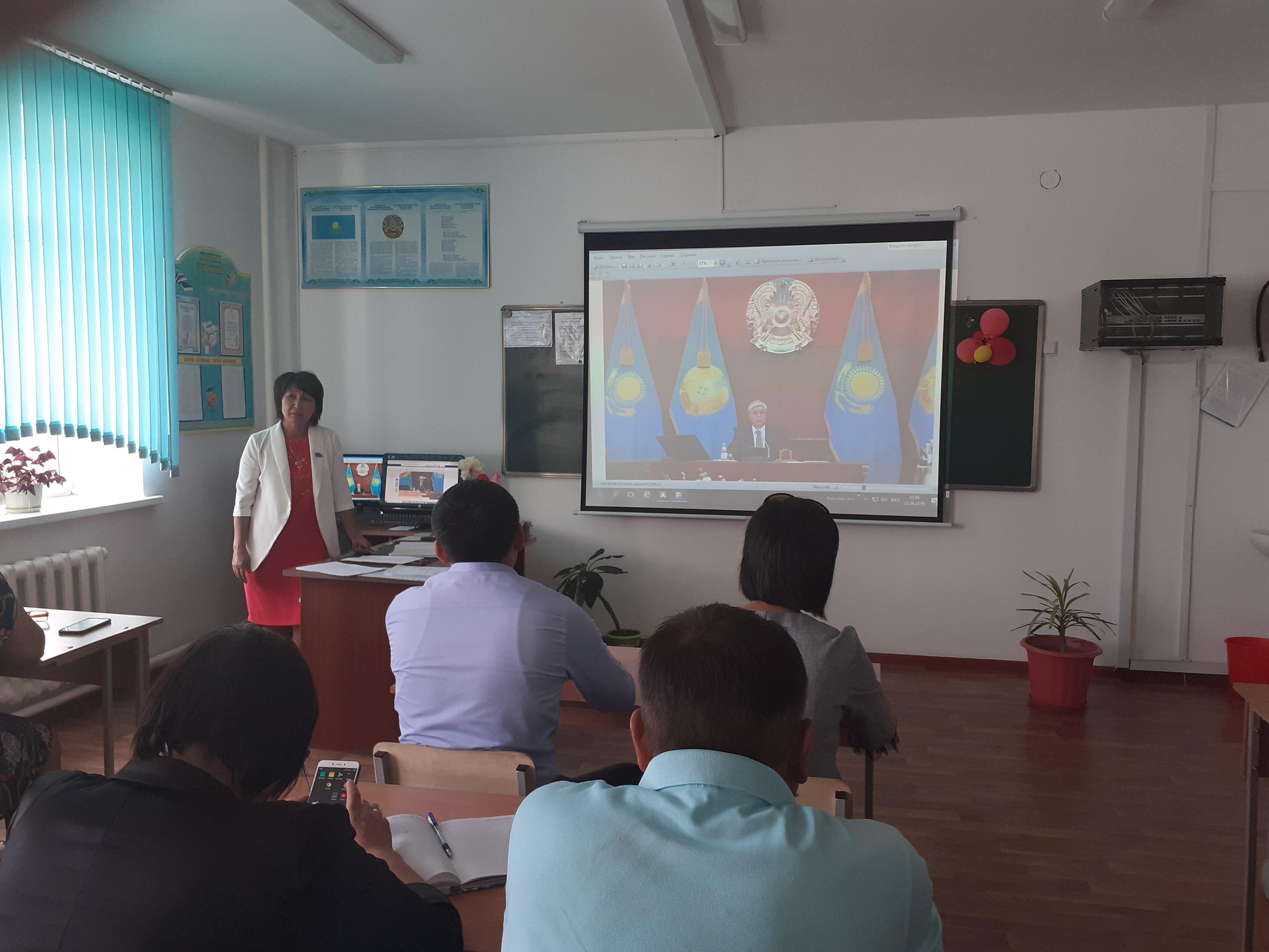 2019 жылдың 4 қыркүйек күні мектебіміздің директоры, облыстық мәслихат депутаты Ибраимова Рахат Нығметбекқызы Қазақстан Республикасының Президенті Қасым-Жомарт Кемелұлы Тоқаевтың «Сындарлы қоғамдық диалог –Қазақстанның тұрақтылығы мен өркендеуінің негізі» атты халыққа Жолдауымен жан-жаққа таныстырып өтті. «Біз жыл сайын мемлекет президентінің халыққа Жолдауын үлкен үмітпен күтеміз. Биылғы Қасым-Жомарт Кемелұлы Тоқаевтың алғашқы Жолдауы мемлекетімізді дамытуға, халқымыздың әлеуметті-экономикалық жағдайын нығайтуға, еліміздің әл-ауқатын арттыруға бағытталып отыр.