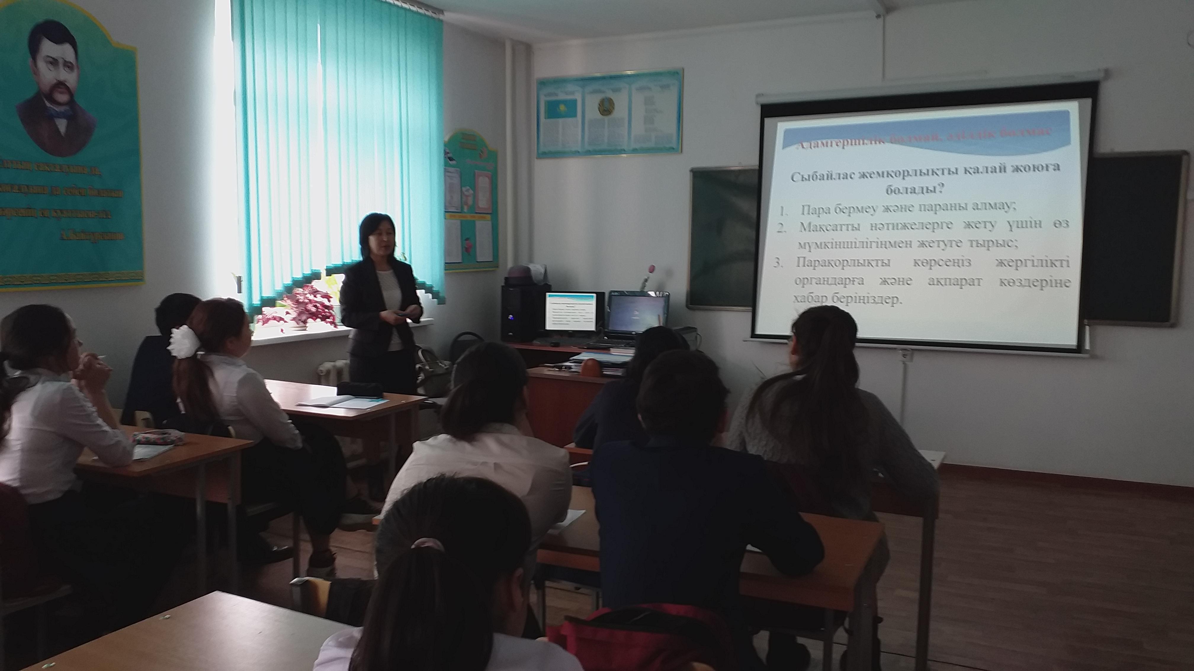 Е. Сиқымов атындағы орта мектебі, мектеп жанындағы интернатымен КММ-де жоспарға сәйкес 12 наурыз күні 7-11 сыныптар арасында «Адалдық сағаты», 9а,8ә сыныптар арасында «Адал ұрпақ-Мәңгілік ел», 9 ә сыныпта «Адалдық сағаты», 11 а сыныпта «Адалдық жүрген жерде адамдық жүреді», 7 а, 7ә сыныптарда «Адалдық-асыл қасиет», 8 а сыныпта «Біз жемқорлыққа қарсымыз» тақырыптарда тәрбие сағаттары жоғарғы деңгейде өтті.